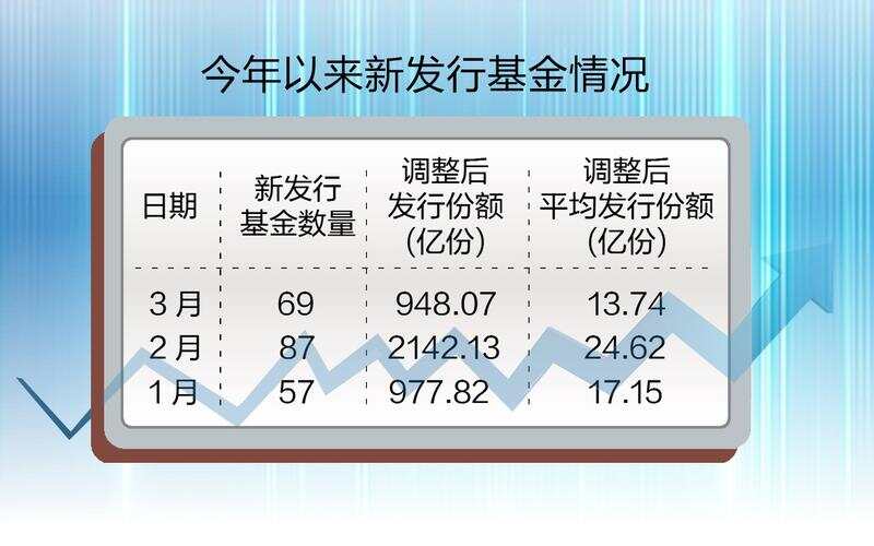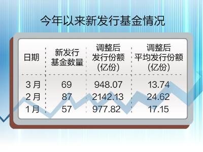 每逢股票市场表现不佳时,权益类基金发行也会迅速降温。统计数据显示,以认购起始日计算,3月以来新发行的基金共有69只,合计发行规模为948.07亿元,平均规模13.74亿元; 2月新发行的87只新基金,平均发行规模达到24.62亿元,合计发行规模为2142.13亿元;1月成立的57只新基金,平均发行规模为17.15亿元,合计发行规模为977.82亿元。