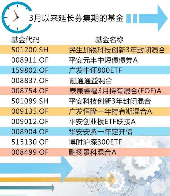 据不完全统计,3月以来已有11只基金发布了延长募集期公告,包括鹏扬景科混合A、民生加银科技创新3年封闭混合、平安元丰中短债债券A、广发中证800ETF、融通通益混合、泰康睿福3月持有混合(FOF)A、平安科技创新3年封闭混合、广发恒隆一年持有期混合A、平安创业板ETF联接A、华安安腾一年定开债、博时沪深300ETF。而在2月份,仅有创金合信鑫益混合C和德邦锐恒39个月定开债A基金延长了募集。