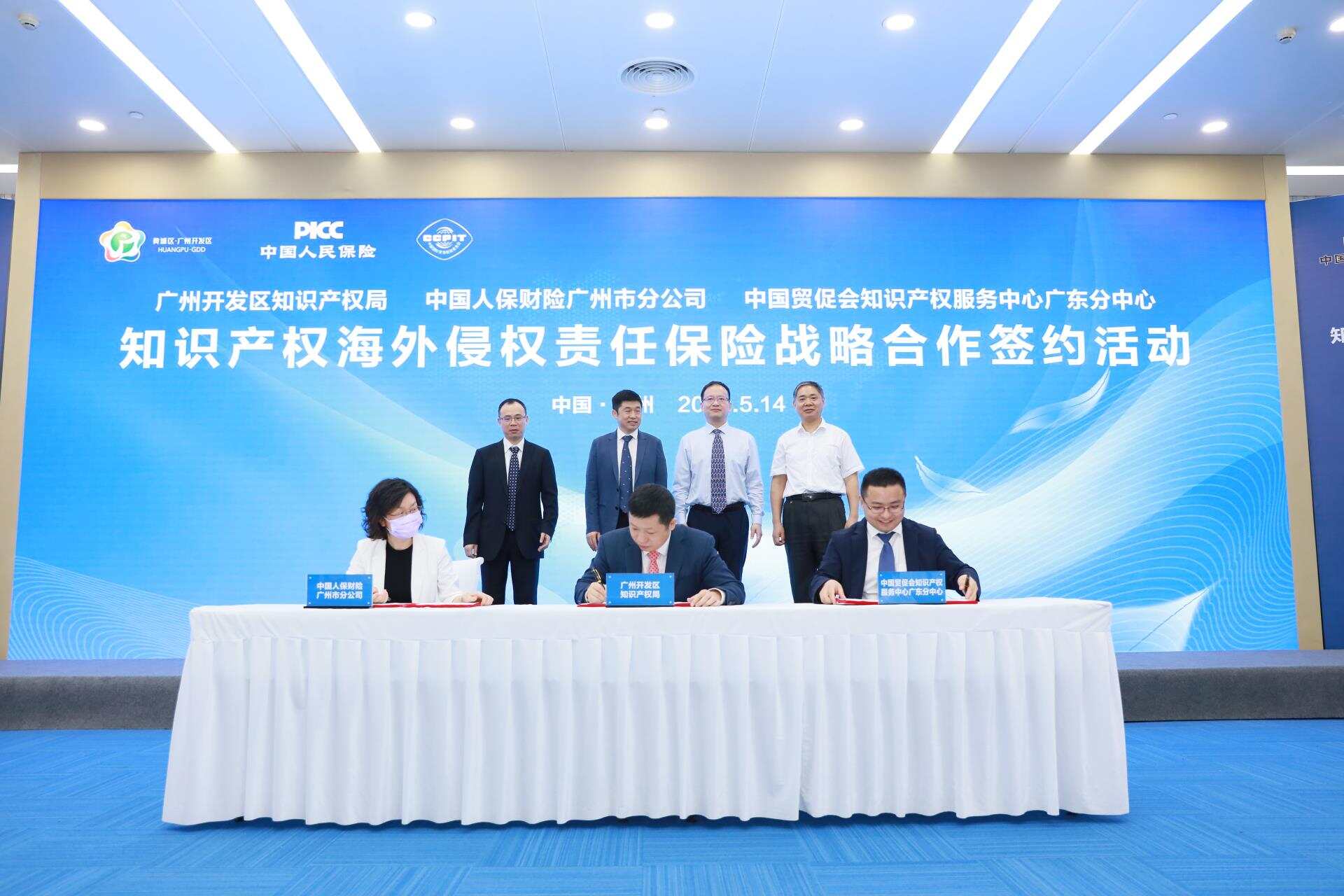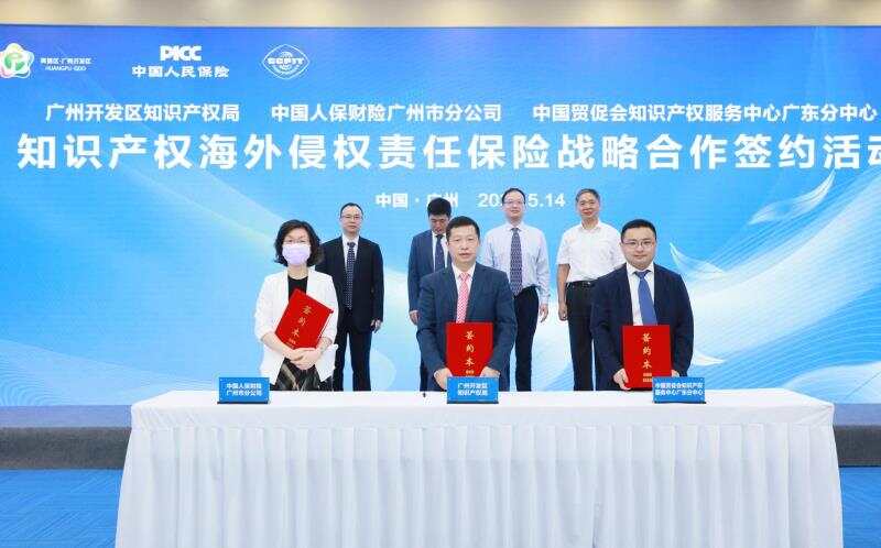 5月14日,广州市黄埔区、广州开发区联合中国人民财产保险股份有限公司广州市分公司、中国贸促会知识产权服务中心广东分中心,在广州科学城会议中心举办“知识产权海外侵权责任保险战略合作协议签约仪式”,共同见证全国第一单海外知识产权侵权责任保险保单在广州市黄埔区落地。