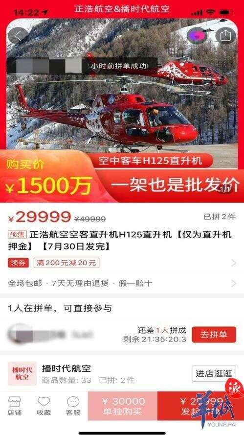 本场直播活动累计吸引了百万拼多多网友观看,截至活动结束时,直播间里一架售价1500万元的空客H125直升机,显示“已经拼单2件”。