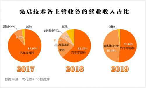 今年6月,光启技术公布2019年年报,净利润增速下跌的态势得到扭转,归母净利润达1.15亿元,同比增长63.02%,超材料业务对营业收入的贡献率大幅上升至45.56%。光启技术在今年上半年业绩预告中宣称:“(上半年)公司主营业务实现了根本转变,从传统汽车零部件的生产制造转型成为超材料尖端装备的研制与生产。”