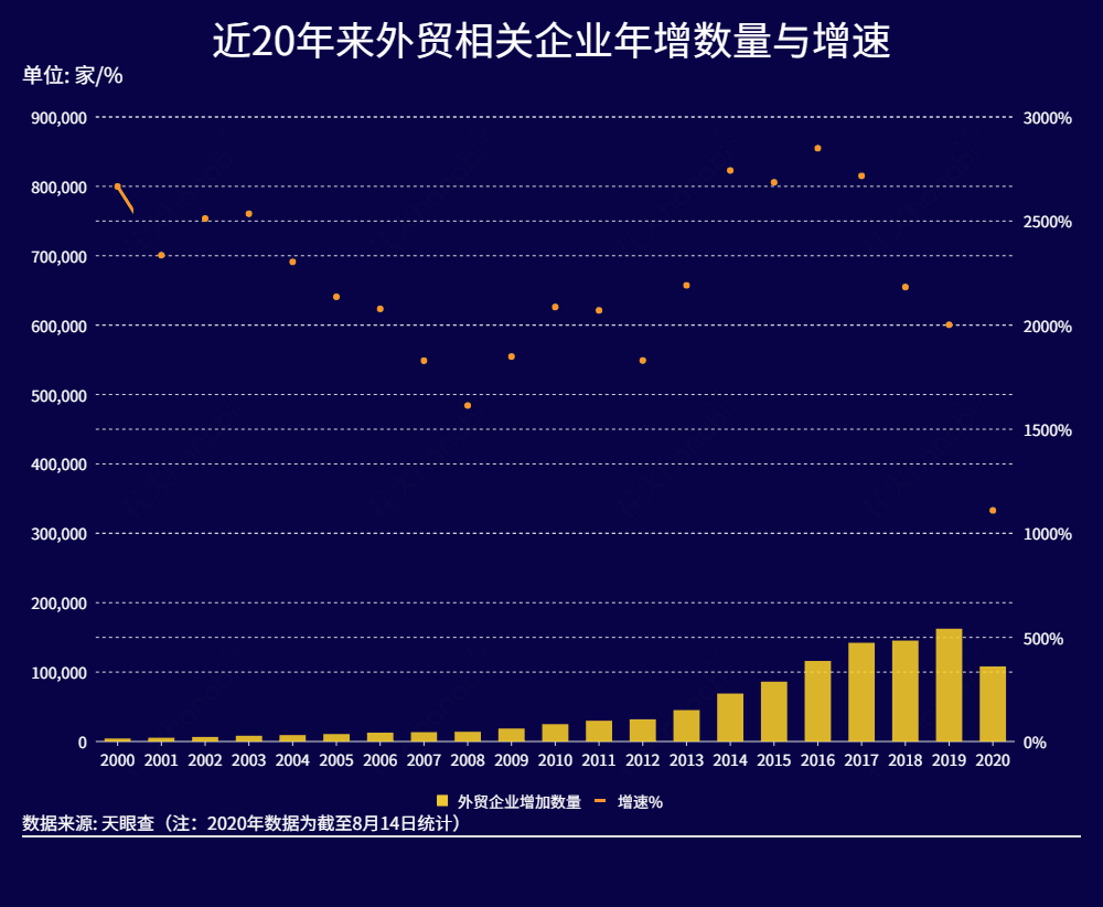 值得注意的是,天眼查专业版数据显示,进入21世纪以来,我国外贸相关企业(全部企业状态)的年度注册数量稳定增长,增速维持在14-24%。2014-2016年,更保持超过25%的年增长速度,2017年起,我国连续三年新增80万余家外贸相关企业。