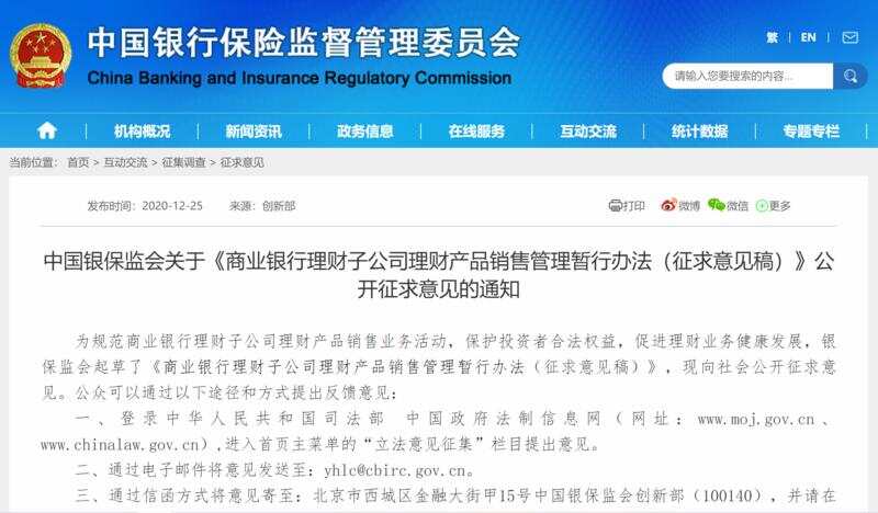 12月25日,银保监会发布《商业银行理财子公司理财产品销售管理暂行办法(征求意见稿)》(下称《办法》),拟作为《商业银行理财子公司管理办法》的配套制度适时发布实施。