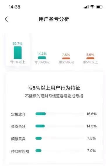 但即便是定投,不少基民也很难在宽幅震荡行情中坚持住。数据显示,过去一年持仓的基民中,放弃定投是亏损用户中排名第一的操作。