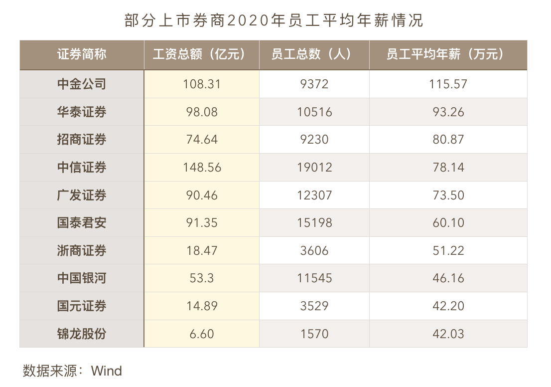 2020年市场行情向好之下,券商业绩与估值齐飞的同时,员工薪酬也“水涨船高”。“券商一哥”中信证券不出意外位列第一,其薪酬总额高达148.56亿元。中信证券2020年新增员工3000余人,总数接近2万人,员工平均薪酬78.14万元,较2019年不降反增;去年11月“回A”的中金公司,工资总额也有108.31亿,更以115万元的员工平均薪酬问鼎各大券商之首,员工平均月薪近10万。