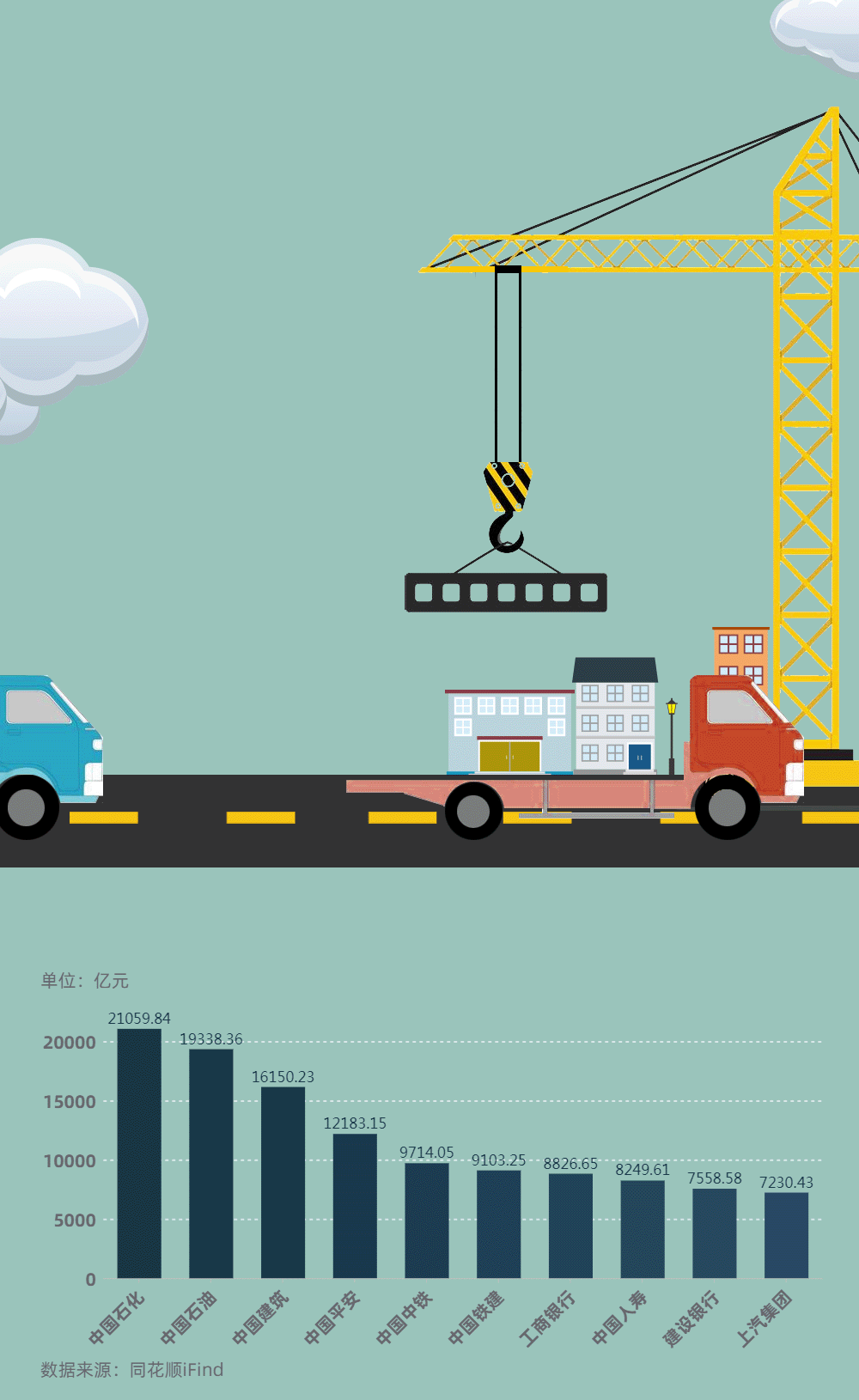 同花顺IFind数据显示,2020年,中国石化成为两市的“营收王”,2020年实现营收高达21059.84亿元,中国石油和中国建筑以19338.36亿元和16150.23亿元紧随其后。