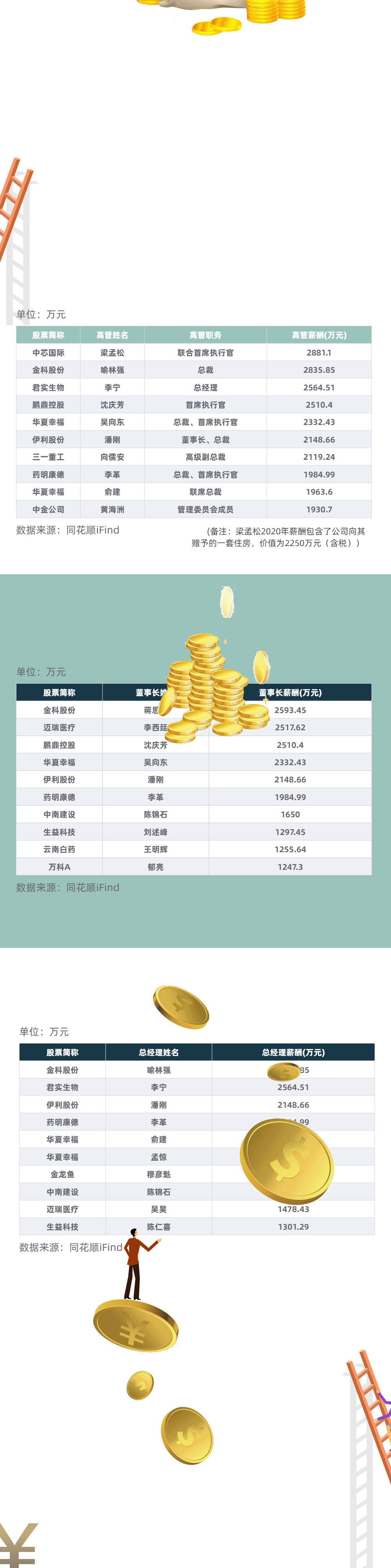高管薪酬哪家强?这一直是吃瓜群众津津乐道的话题。2020年,高管薪酬表现如何?同花顺iFind显示,2020年的A股“打工皇帝”是中芯国际联合首席执行官梁孟松,2020年薪酬为2881.1万元,金科股份总裁喻林强和君实生物总经理李宁分别夺得薪酬亚军和季军,当年薪酬为2564.51万元和2835.85万元。