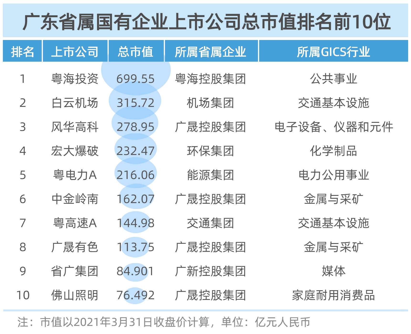 从资产规模来看,粤电力A、粤海投资是省属国有上市公司总资产的“第一梯队”,明显高于其他公司,有10家上市公司的总资产超过100亿元。以今年3月31日收盘价计算,总市值高于200亿元的有5家,分别为粤海投资、白云机场、风华高科、宏大爆破、粤电力A,高于100亿元的总计8家。