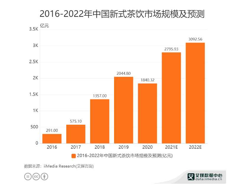 与之相对应的,2019年中国新式茶饮市场规模为2044.8亿元;受疫情影响,2020年市场规模缩减至1840.32亿元。但艾媒咨询预测,从长期来看,新式茶饮还将呈扩大态势,预计2021年,新式茶饮将恢复甚至是超过疫情前水平,市场规模接近2800亿元。