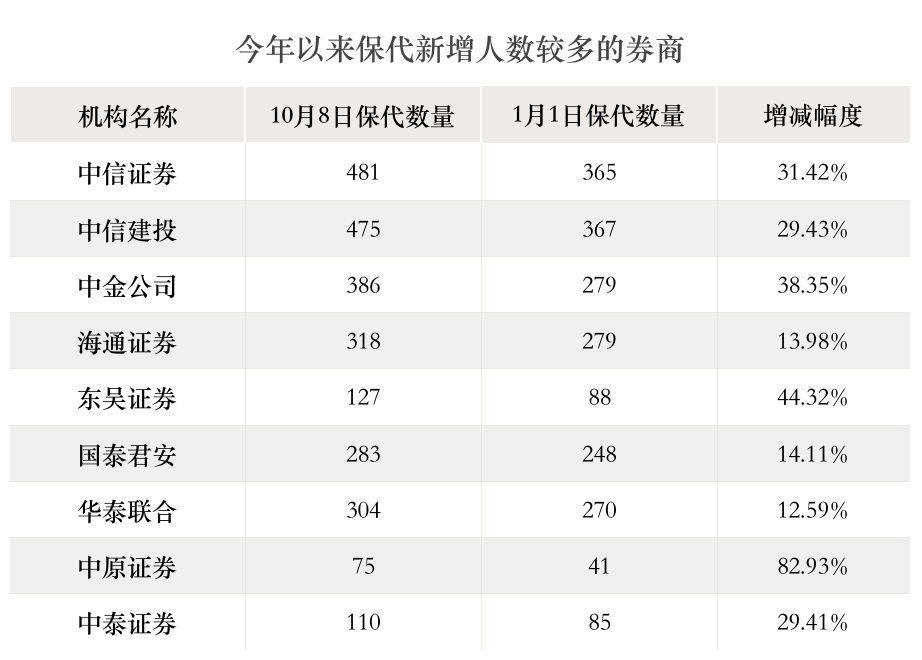 数据显示,截至10月8日,共有两家券商保代人数已经突破400人,中信证券与中信建投分别有481人、475人。中金公司、海通证券、华泰联合分别以386名、318名、304名保代依次排在3-5位。