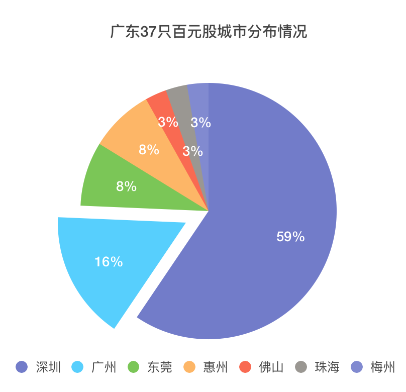 而从省内分布来看,这37只广东百元股中,有22只来自深圳,6只来自广州,东莞、惠州各有3只,佛山、珠海、梅州也各有1只“进账”。