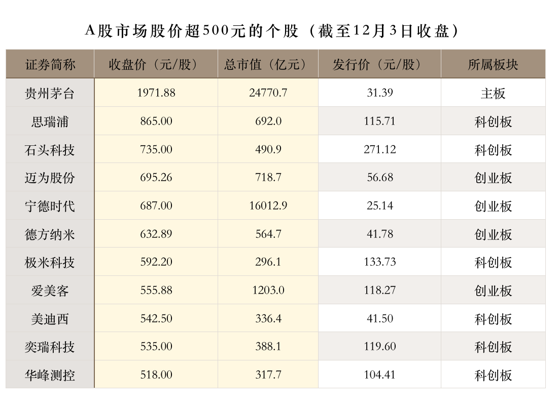 89只科创板百元股中,思瑞浦(688536)以865元/股位居科创板“一哥”位置,石头科技、极米科技位列列科创板百元股的第二、第三位,分别为735元/股、592.2元/股。另据统计,在股价超300元的36只个股中,科创板就有18只,占据“半壁江山”。