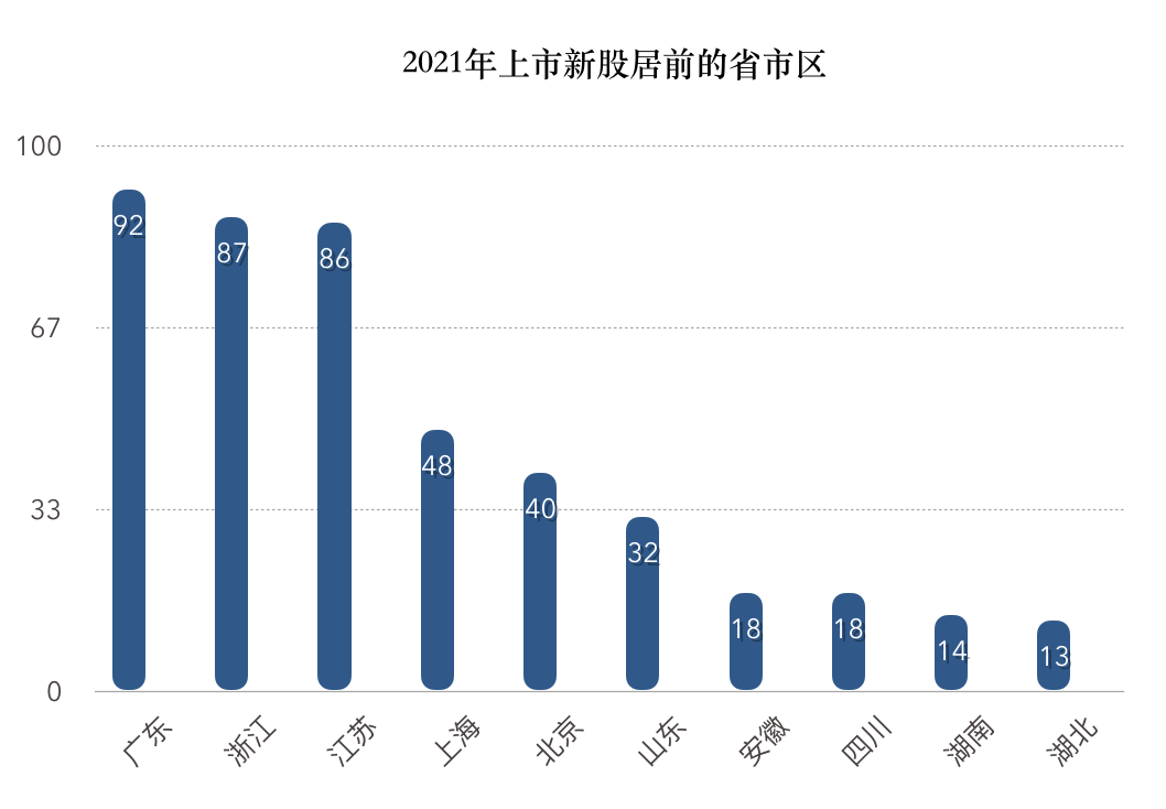 新股数量超过10家的地区还有安徽18家,四川18家,湖南14家,湖北13家,河南、福建也各有10家。