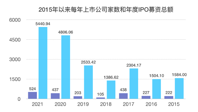 数据显示,截至去年12月31日,全年A股上市新股数量合计达524家,其中核准制下上市企业合计122家(沪市主板88家、深市主板34家),科创板、创业板上市企业分别为162家和199家,北交所上市企业41家。整体来看,2021年524家上市公司合计募资金额超过5400亿元,2021年IPO企业数量和募资金额分别同比增长了20%、13.21%。