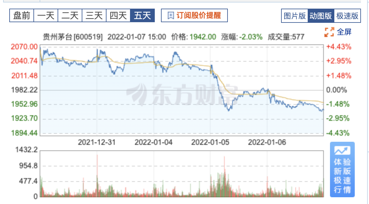 这样的消息属利好吧?可是,二级市场上,贵州茅台(600519)的股价却在这段时间接连“向后转”,开年4个交易日“四连阴”,周跌幅达5.27%;而就在去年末珍品酒传出即将推向市场的消息时,去年12月29日当天放量大跌4.54%,从而打开了近期的下跌通道,形成短期向下破位走势。去年12月24日,贵州茅台最高还达到2216.96元,本周收盘则报1942元了。