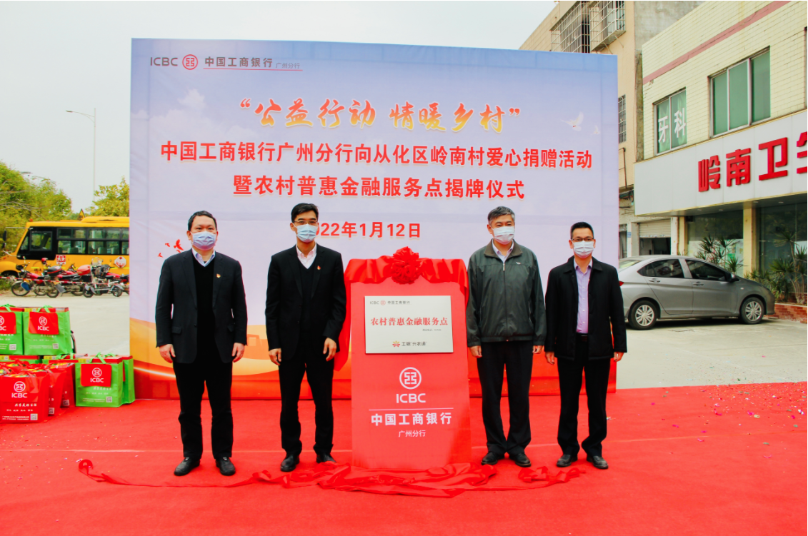 为落实巩固脱贫攻坚成果与乡村振兴的有效衔接,满足区域金融需求和助力乡村经济发展。捐赠活动当日,广州工行在岭南村建设了“兴农通”农村普惠金融服务点并进行了揭牌仪式。在揭牌仪式上,该行相关负责人表示:广州工行将以此为落脚点,在岭南村开展金融讲堂、反金融诈骗活动,少儿财商等各项活动,为村民提供更贴心方便的金融服务。同时,该行将积极贯彻落实乡村振兴战略,结合当地实情情况,与当地政府、企业、村民深度融合,持续探索与建设农村普惠金融,扎实推进乡村振兴高质量发展。
