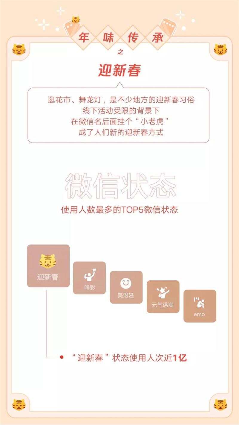 数据显示,微信红包封面领取总数超3.8亿,在拜年红包祝福语中,除“一夜暴富”外,在微信名后面挂“小老虎”成为虎年迎新春方式,其他使用人数最多的微信状态还包括“喝彩”、“美滋滋”和“元气满满”等,体现对新一年的美好期盼。