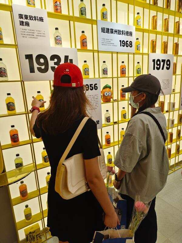 在位于永庆坊的“广氏1934”品牌馆中,记者看到了“广氏”80余年历史上各种饮品陈列其中,口音地道的“老广”们结伴聊着这个熟悉的老品牌,年轻人们则忙着拿起手机与广氏IP“打卡”合照。