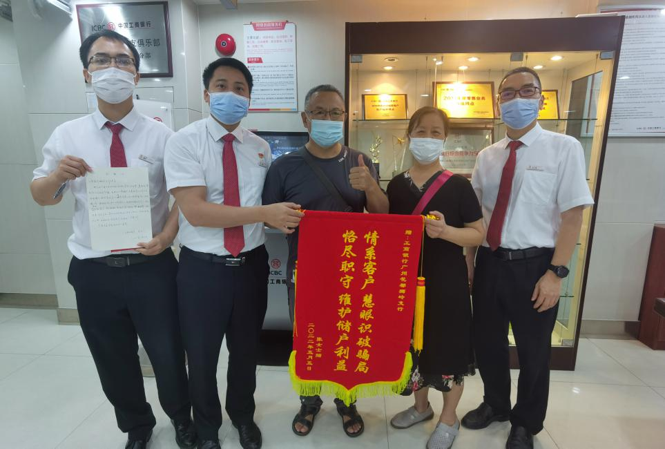 今年5月,两位老人来到工行广州花都狮岭支行送上锦旗和感谢信,感谢网点员工急客户所急,保护客户资金安全。
