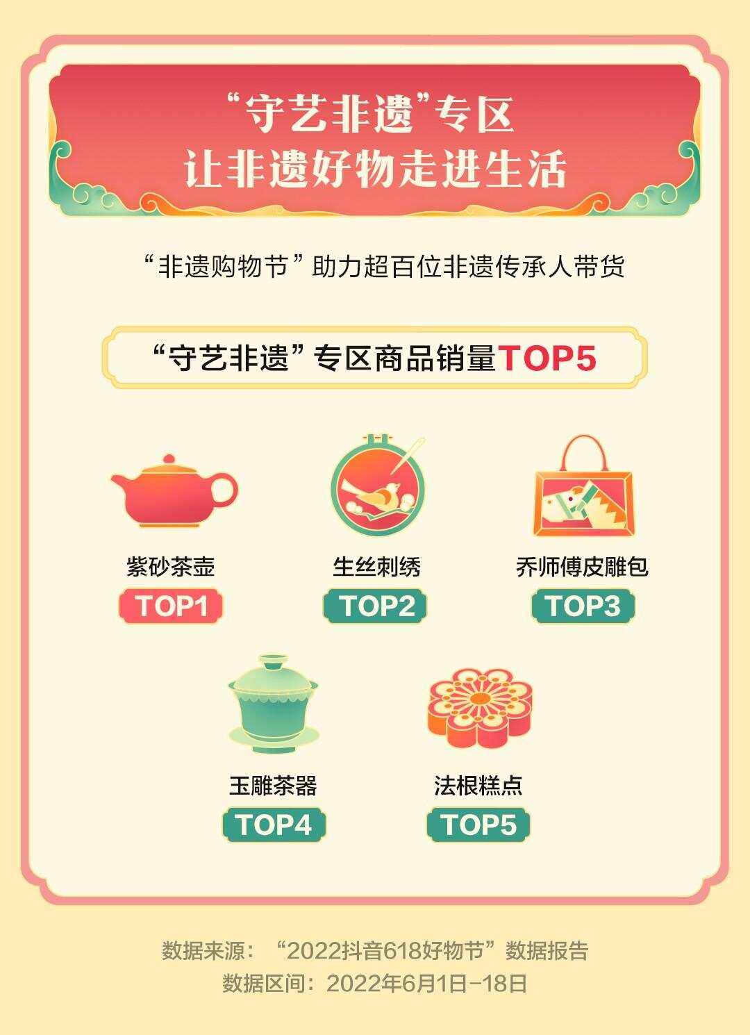 “618”期间,抖音电商举办了“非遗购物节”活动,推出了“守艺非遗”社会价值专区,携手超百位非遗传承人带货,共同助力非遗技艺传承。报告显示,紫砂茶壶、生丝刺绣和乔师傅皮雕包颇受消费者欢迎,玉雕茶器和法根糕点紧随其后。