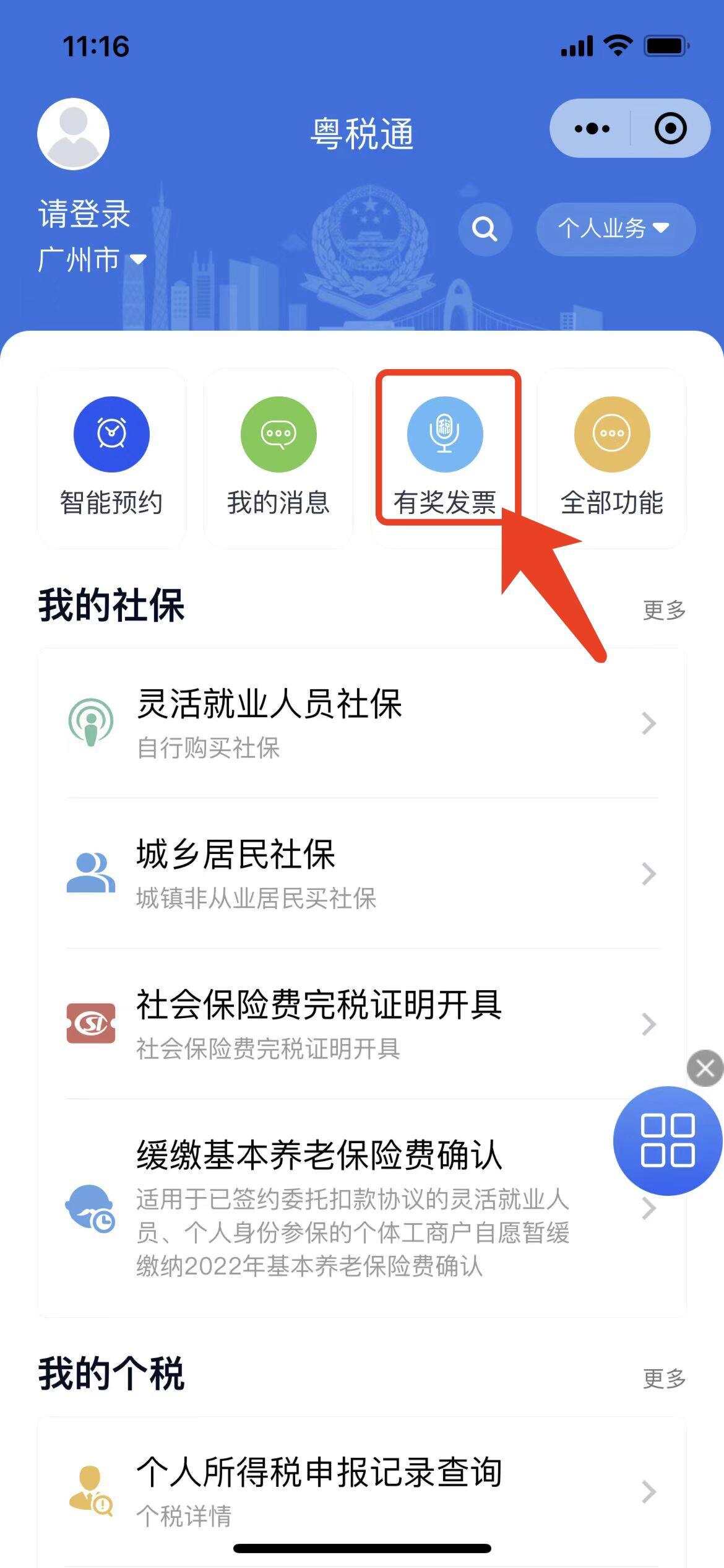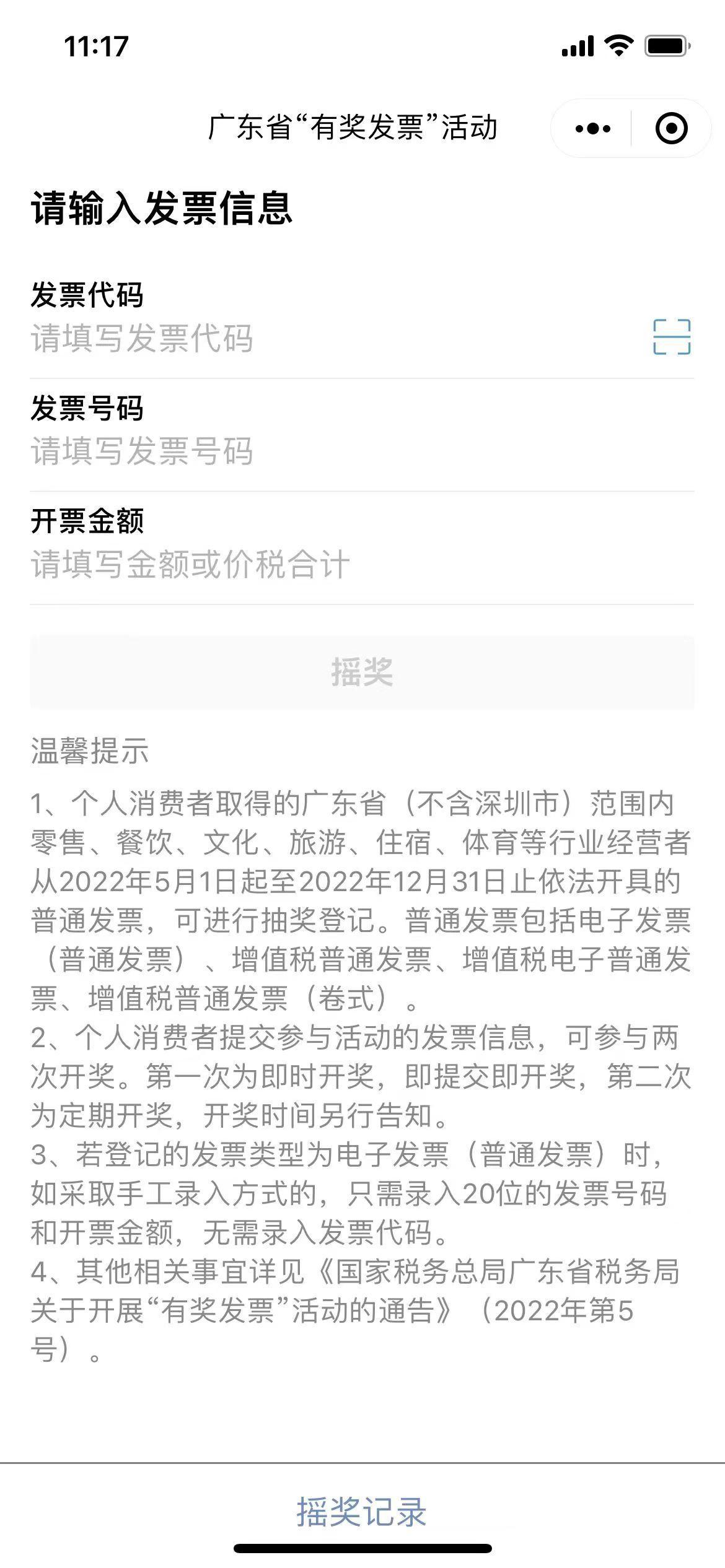 以“粤税通”为例,个人消费者进入“粤税通“小程序后,点击“有奖发票”,在登记页面完成发票信息扫描或输入,成功提交后即可参与活动。