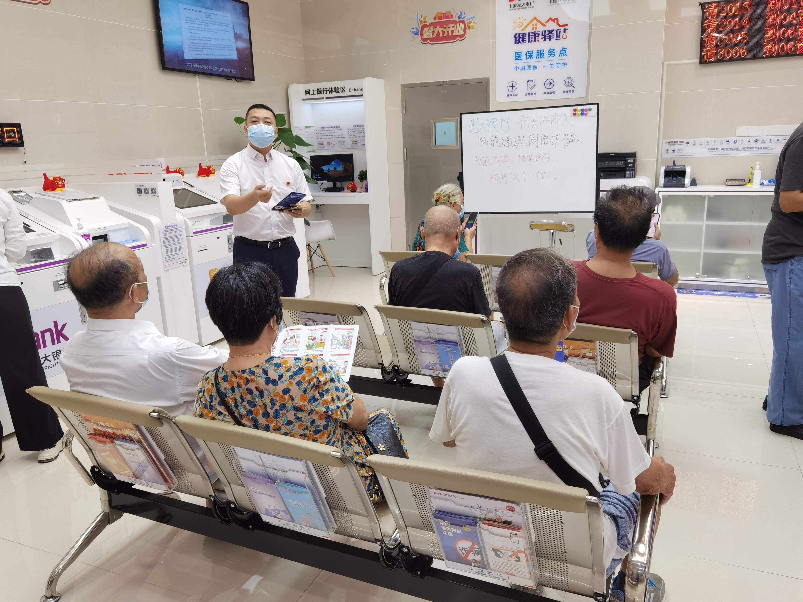 行长们化身金融讲师,向社会宣讲消保。一方面,他们充分运用好网点阵地,聚焦上门客户进行宣传。带头开展“晨会三分钟”“消保微沙龙”等品牌活动,向到店客户宣讲监管发布的重点知识,宣讲自行制作的个性化内容。为更好的融入群众,广州江南西支行的主管行长还用粤语、普通话双语频道开展消保微沙龙,为广州旧城区的老年客户们送上一场又一场浓浓人情味的金融知识教育课;另一方面,支行行长们还走进社区、走进农村、走进学校,守护各层面群众的合法金融权益。在白云区棠涌经济联合社村委会,广州白云支行主管行长开展金融知识讲座,通过案例讲解、模拟情境等方式,为村民耐心讲解反洗钱、防范电信网络诈骗和非法集资等相关金融知识,一对一地回答咨询,提示风险。