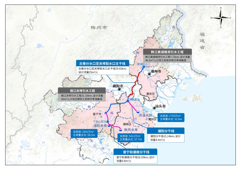 根据工程总体工作方案和工程建设计划,“三江连通”后续优化工程将从韩江鹿湖隧洞引水工程末端的潮安古巷西山溪接收井取水,建设主干输水管道,将潺潺韩江水输送至榕江关埠取水口,再利用榕江关埠引水工程,并通过潮阳分干线、普宁和潮南分干线,分别输水至潮阳区河溪水库、普宁市汤坑水库和潮南区秋风水库。