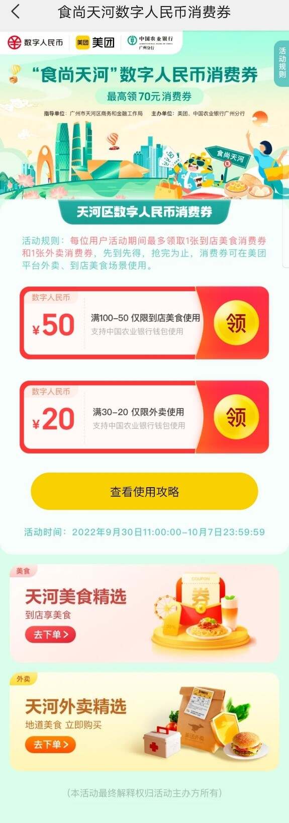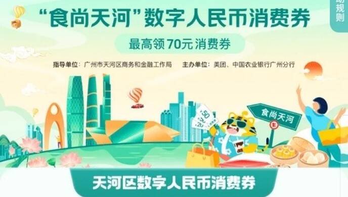 9月30日11:00起,在广州市工作和生活的市民可登陆美团App、大众点评App搜索“天河消费券”抢券。消费券的使用范围为位于天河区指定的美团外卖和餐饮商户,市民可按照规则,在美团用数字人民币订外卖和购买堂食套餐时抵扣使用。