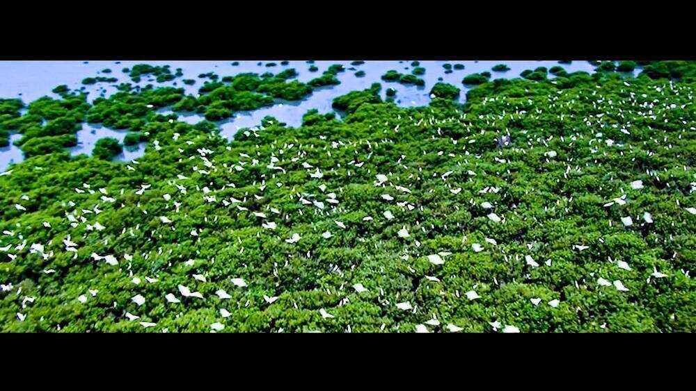 “红树们在这广阔的天地自由生长,吸引了好多小客人来做客。弹涂鱼表演了跳舞和爬树,黑脸琵鹭的‘扫雷’游戏堪称一绝,招潮蟹挥舞着‘大刀’来了一段武术操,白鹭的空中飞行秀犹如仙子翩然而来……”