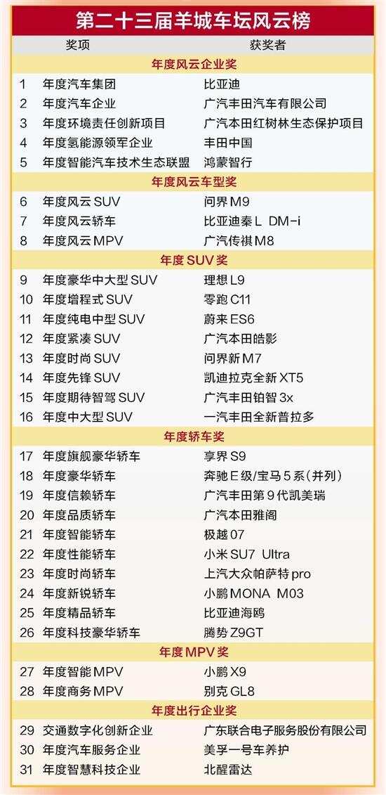 其中,评审组从上百款热门车型中,结合品牌影响力、人气、口碑、技术创新等多维度指标,评选出年度风云SUV、年度风云轿车和年度风云MPV三大车型及细分奖项,获奖车型是今年车坛中当之无愧的引领风云的实力派。对于消费者而言,完全可以以“第二十三届羊城车坛风云榜”获奖车型作为权威指南进行购车参考。展望2025年,以创新应万变,中国汽车产业毫无悬念仍将引领全球汽车产业变革大潮,让我们在此致敬那些为中国汽车产业作出贡献的企业和汽车人们。