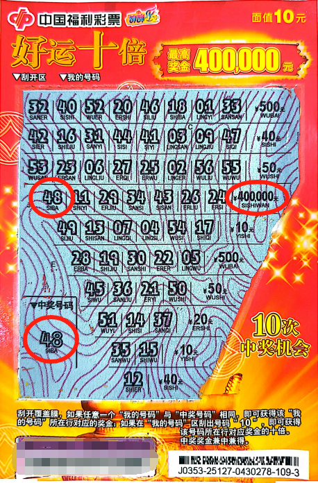 福彩众多游戏中,刮刮乐即开票凭借其即刮即兑、玩法多样、趣味性强等特点,受到不少购彩者的喜欢。“好运十倍”刮刮乐即开票玩法简单、通俗易懂。如果任意一个“我的号码”与“中奖号码”相同,即可获得该“我的号码”所在行对应的奖金;如果在“我的号码”区刮出号码“10”,即可获得该号码所在行对应奖金的十倍。中奖奖金兼中兼得。