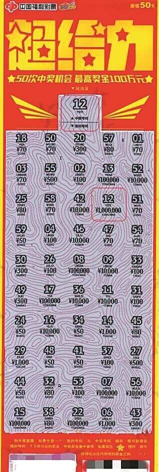 据李女士回忆,当天中午,她和家人去万象汇商场逛街,路过福彩销售站点时,见到刮刮乐展示柜前有不少人在刮奖,现场十分热闹。她当即上前买了两张“超给力”刮刮乐即开票,和丈夫一人一张开刮。当刮到第三行覆盖膜时,出现了数字“12”,再刮开其对应的奖金区域为“¥1000000”。