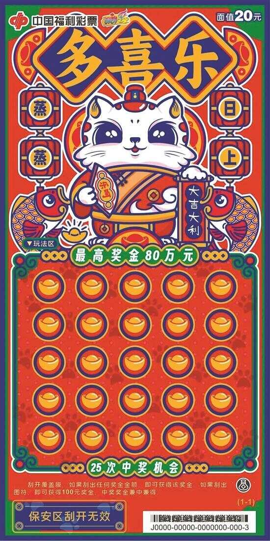 刮刮乐新票“多喜乐”采用国潮风设计,以红色为主色调,搭配蓝色和黄色,色彩鲜艳,充满喜庆氛围。本次上市的新票有10元、20元两种面值,最高奖金分别为30万元、80万元。“多喜乐”玩法简单,刮开覆盖膜,如果刮出任何奖金金额,即可获得该奖金;如果刮出“钱袋”图符,即可获得100元奖金。中奖奖金兼中兼得。