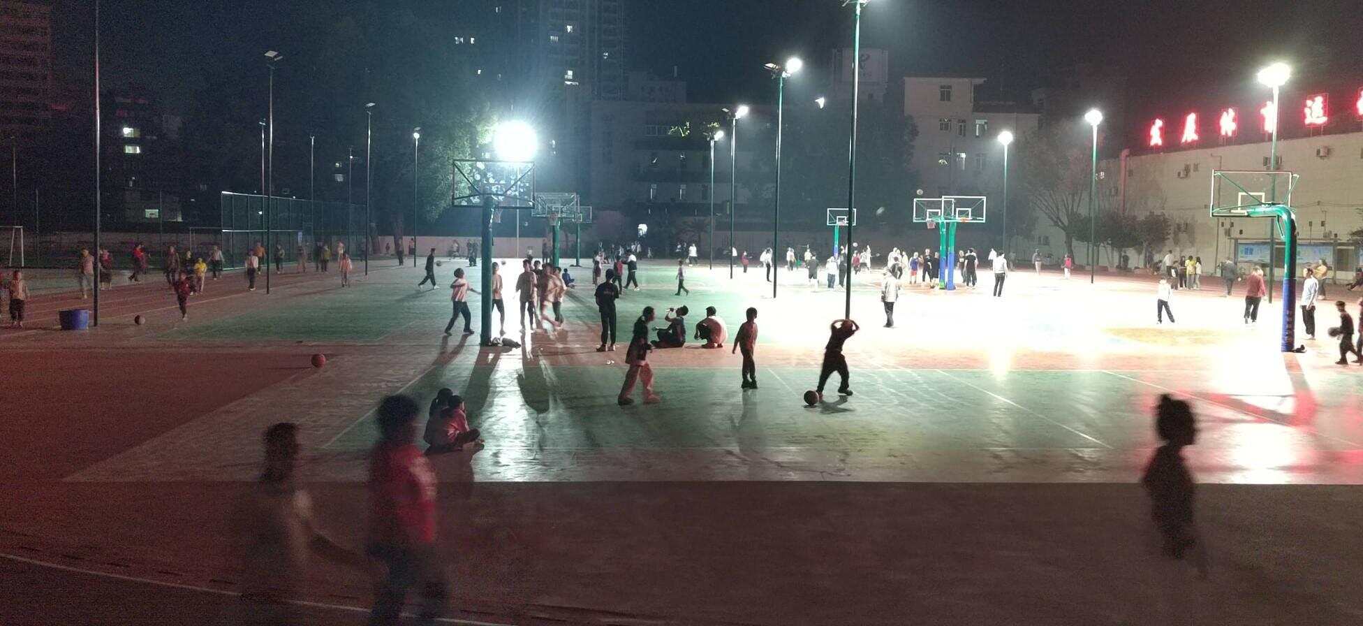 即使是周末的夜晚,广东省河源市龙川县麻布岗中学的体育场内依旧灯火通明。雨后微湿的塑胶跑道上,居民王女士与家人散步的身影与球场上的欢呼声交织,构成一幅生动的全民健身图景。