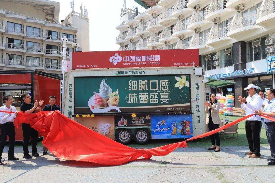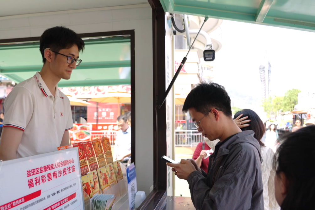 在大梅沙海滨公园的不远处,人群熙熙攘攘,热闹非凡。在这喧嚣的氛围中,一辆挂着“中国福利彩票”站点编号83872958红色招牌的花车格外引人注目。花车虽然只有四五平方米,但里面却别有洞天,福利彩票销售与便民商品零售巧妙融合,让路过的顾客不仅能在这里购彩,还能选购雪糕、矿泉水等商品。