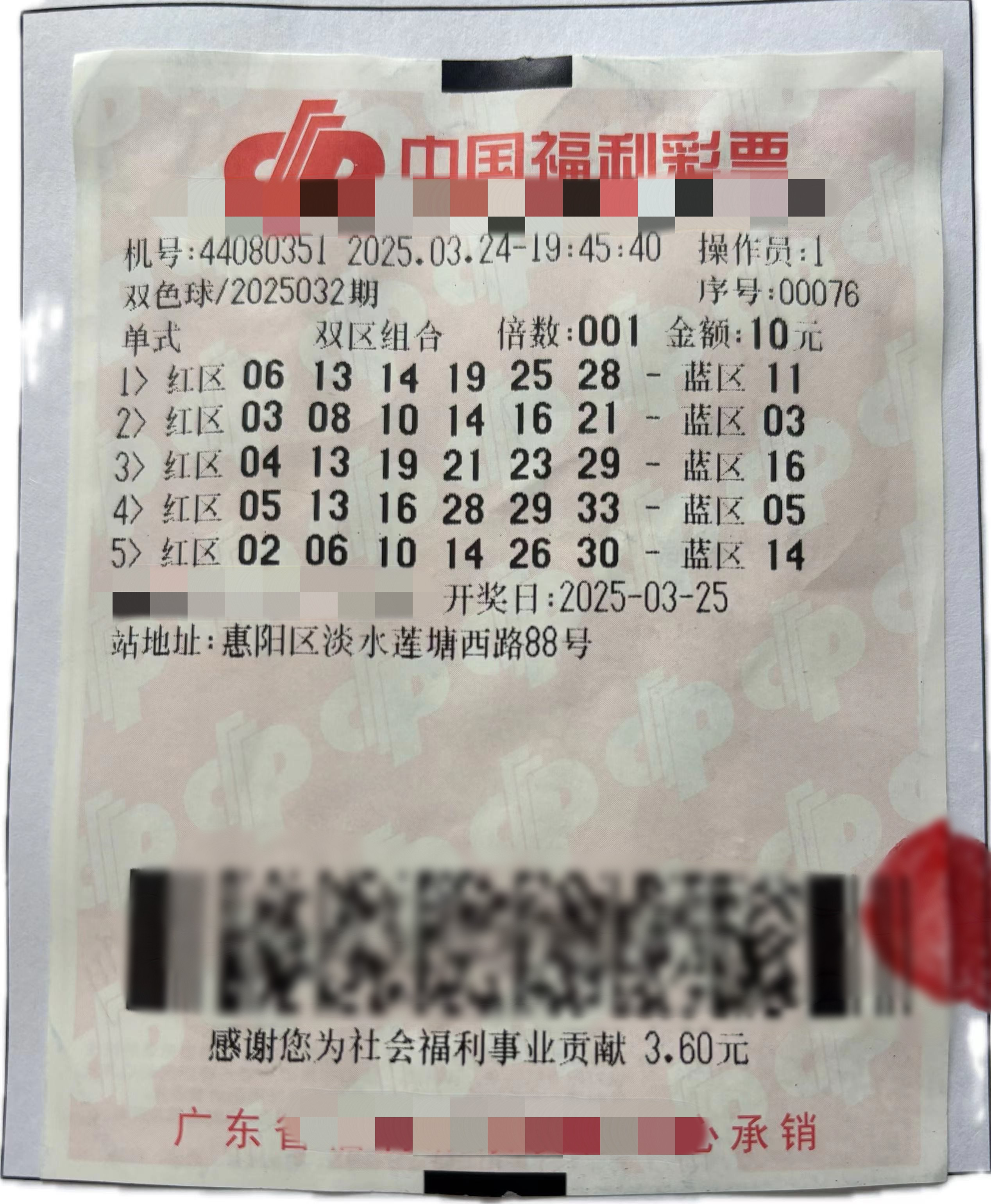 记者从惠州市福彩中心获悉,3月25日,福利彩票双色球游戏第2025032期开奖,当期全国共中出一等奖6注,其中1注花落惠州市惠阳区淡水莲塘西路44080351福彩销售站点,中奖彩票为一张10元单式机选票,中奖奖金794万元。这是今年惠州中出的第3注双色球一等奖。